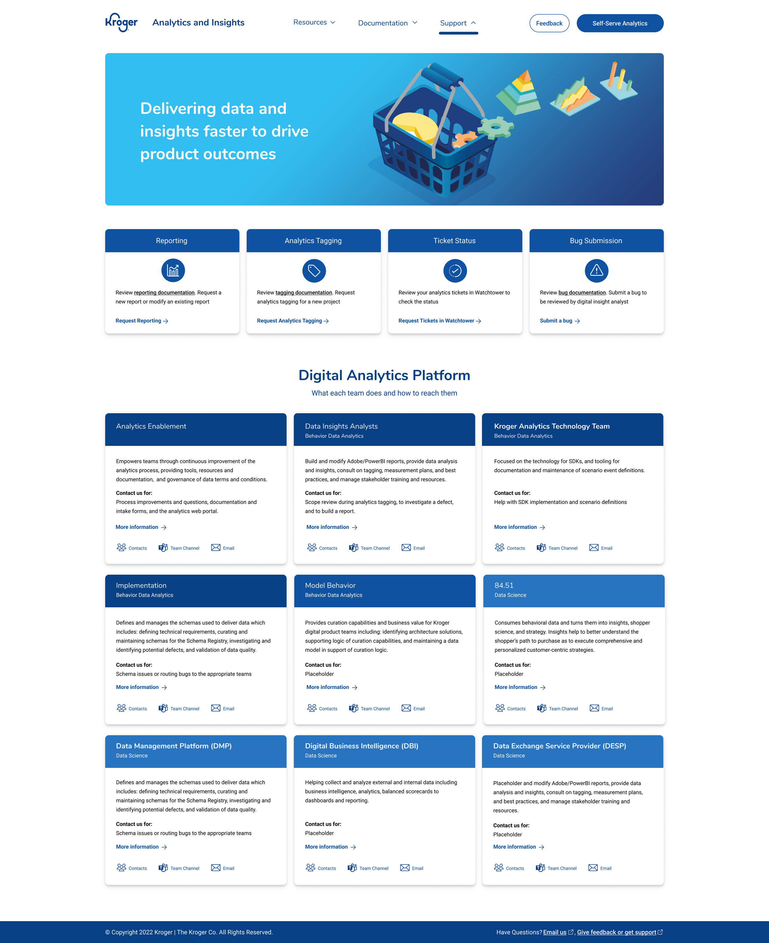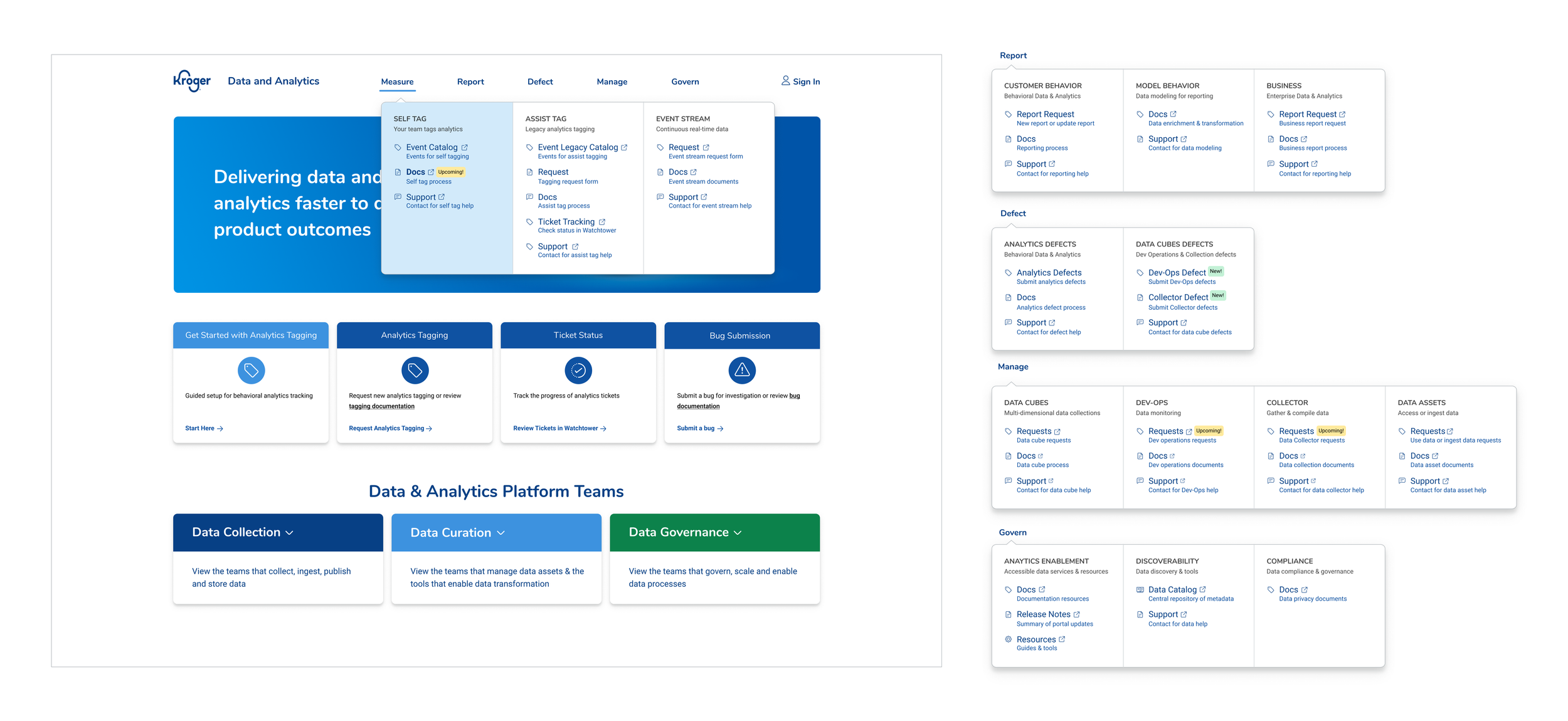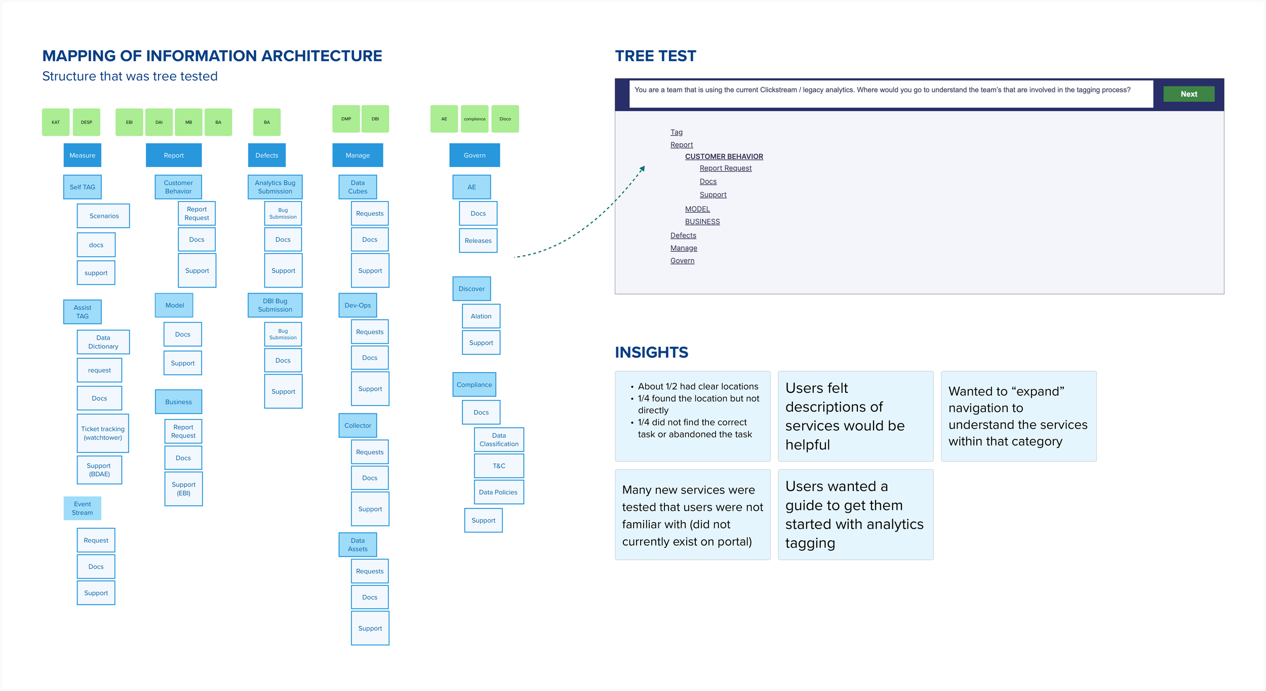 Analytics Enablement was combined with other data & analytics teams & was no longer focusing only on BDA. Our work up to this point was focused on Behavioral Data & Analytics. We were no longer focused on improving & documenting processes, but focused on creating a portal that is a central hub for all things data & analytics. We interviewed the added teams and their customers and expanded our scope. This meant that the simple navigation would no longer work because we needed to expand services and access to those services.