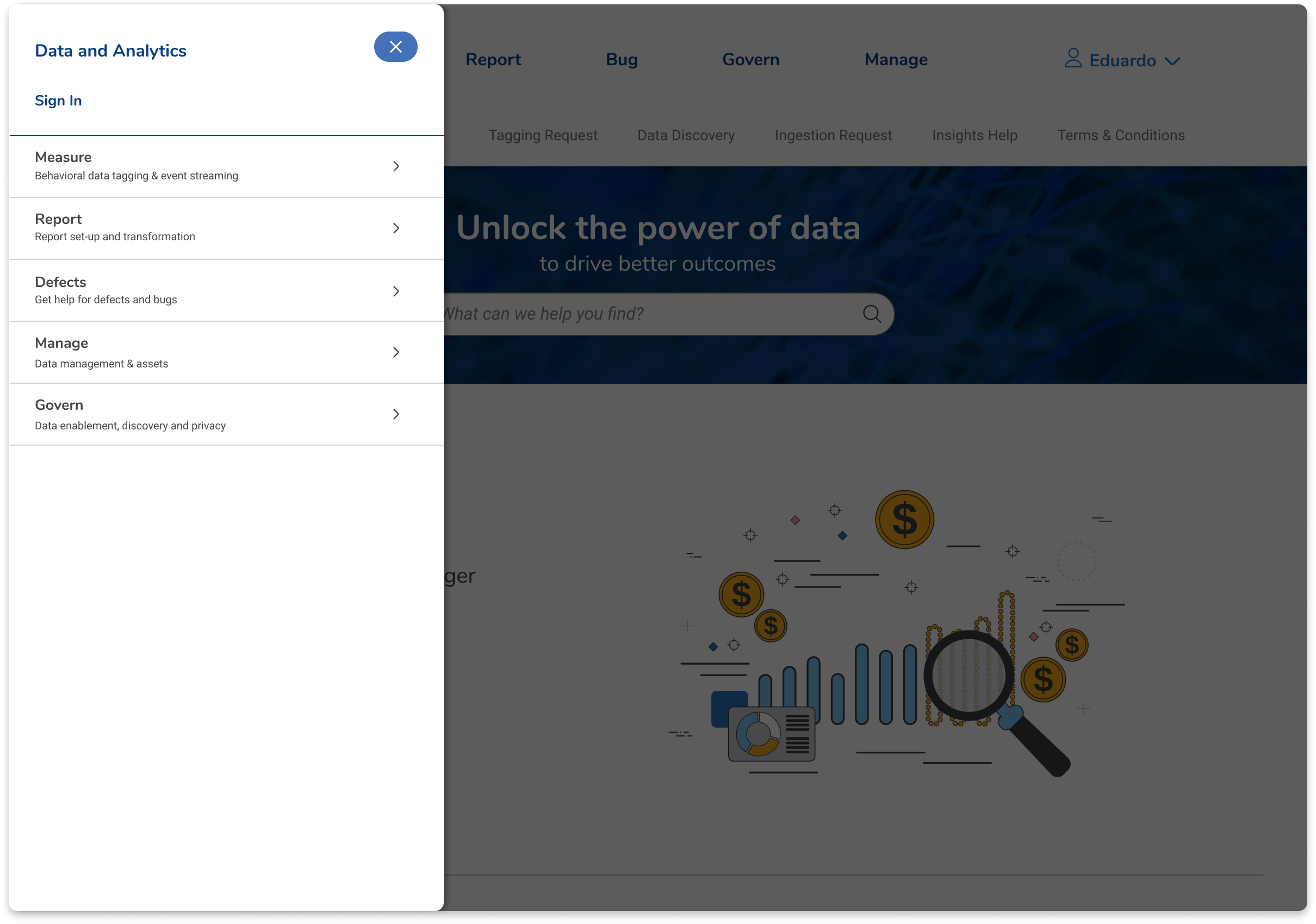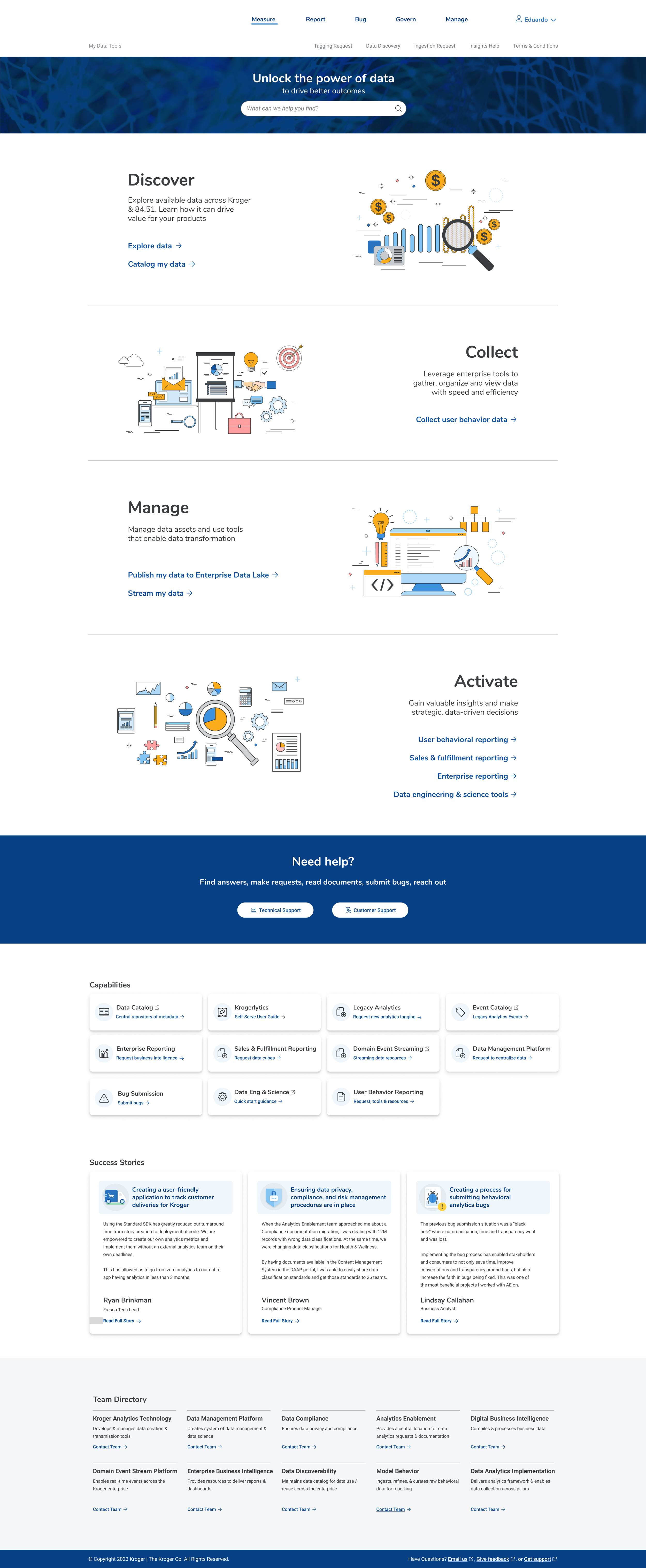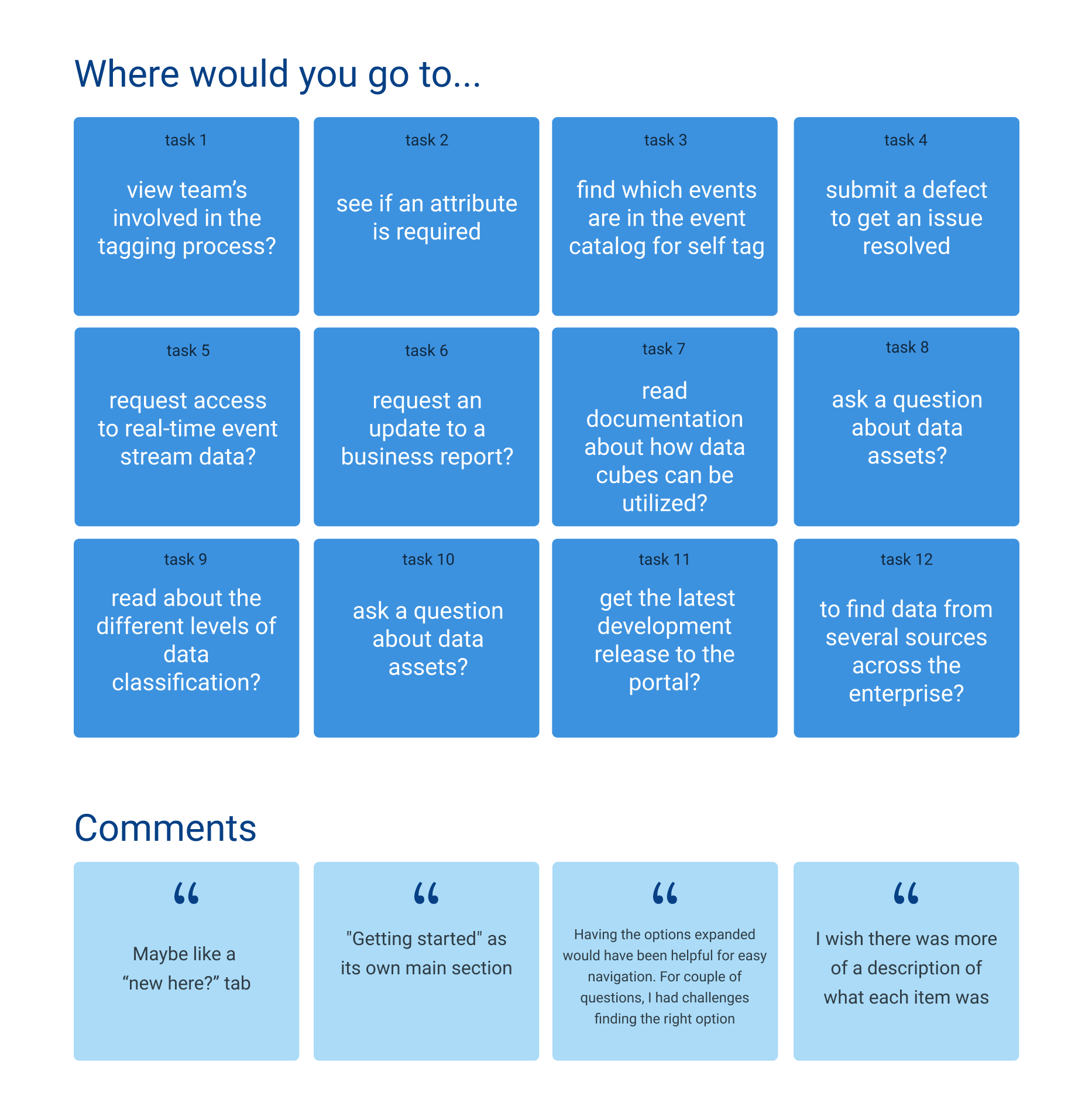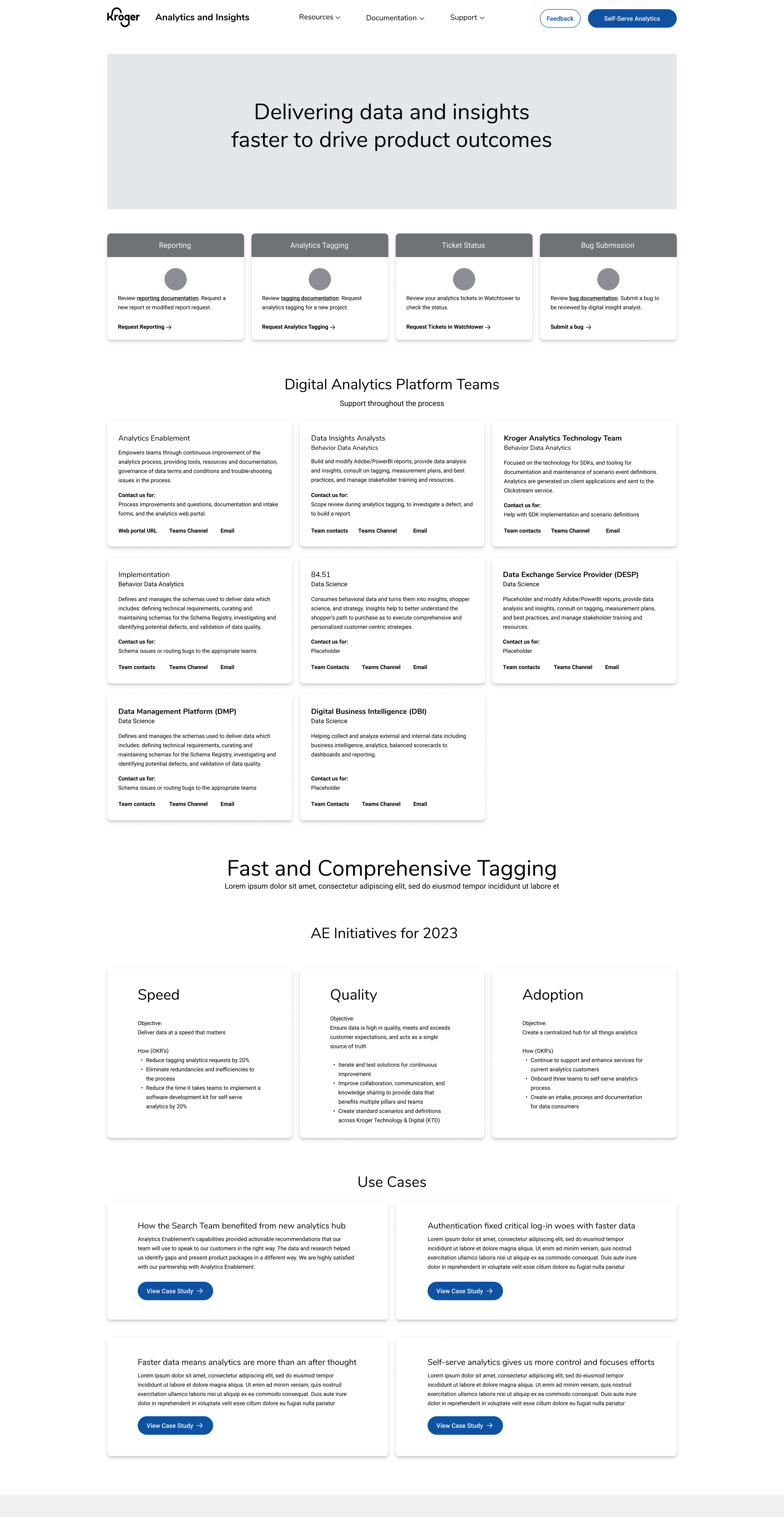 Analytics Enablement was combined with other data & analytics teams & was no longer focusing only on BDA. Our work up to this point was focused on Behavioral Data & Analytics. We were no longer focused on improving & documenting processes, but focused on creating a portal that is a central hub for all things data & analytics. We interviewed the added teams and their customers and expanded our scope. This meant that the simple navigation would no longer work because we needed to expand services and access to those services.